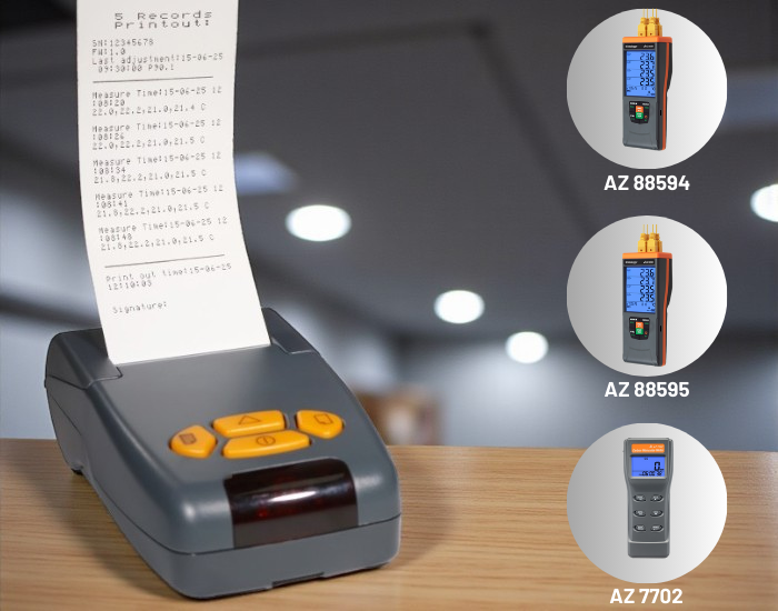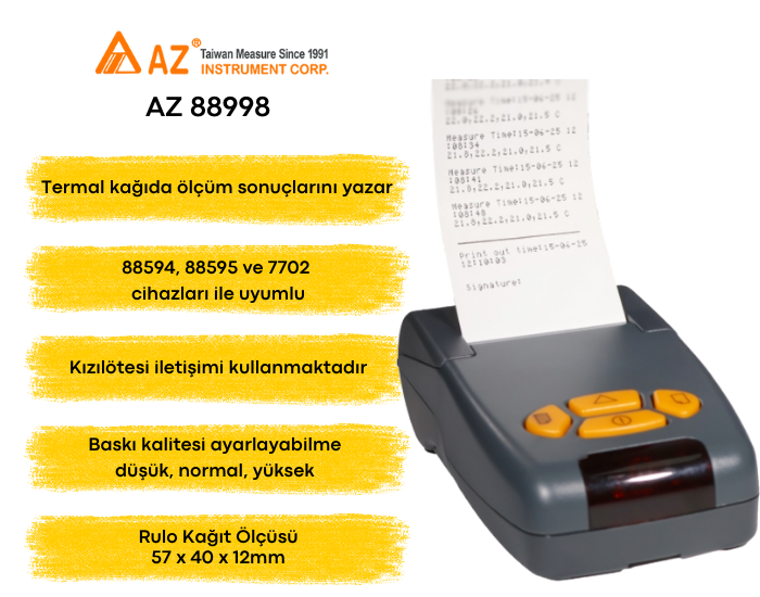 AZ 88998 termal yazıcı; ölçüm verilerinin sahada ya da laboratuvar ortamında anında dökümünü almak için tasarlanmış ekonomik fiyatlı bir yazdırma çözümüdür. Yalnızca AZ 88594, AZ 88595 ve AZ 7702 cihazlarıyla tam uyumluluk gösteren bu yazıcı, kullanıcıların elde ettikleri ölçüm verilerini hızlı ve güvenilir şekilde kağıda aktarmasına imkân tanır.