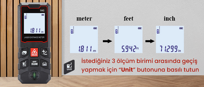 - Cihaz, metre, inç ve feet birimleri arasında geçiş yapabilir. Bu özellik, farklı ölçü sistemleriyle çalışan kullanıcılar için büyük kolaylık sağlar.