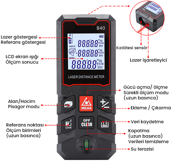 -B40’ın entegre ettiği alan ve hacim hesaplama, Pisagor teoremiyle dolaylı yükseklik ölçümü, toplama-çıkarma işlemleri, referans noktası seçimi (cihazın önünden veya arkasından ölçüm) gibi işlevsel özellikler, kullanıcıyı ekstra hesap makineleri veya elle hesaplama ihtiyacından kurtarır.