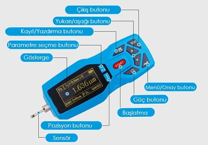 - Bu pürüzlülük ölçer, farklı ulusal ve uluslararası standartlara göre birçok parametre ile yüzey dokularını değerlendirebilir. Ölçüm sonuçları, OLED ekranda dijital/grafik olarak gösterilir ve harici olarak satın alacağınız bir yazıcıya aktarılabilir.