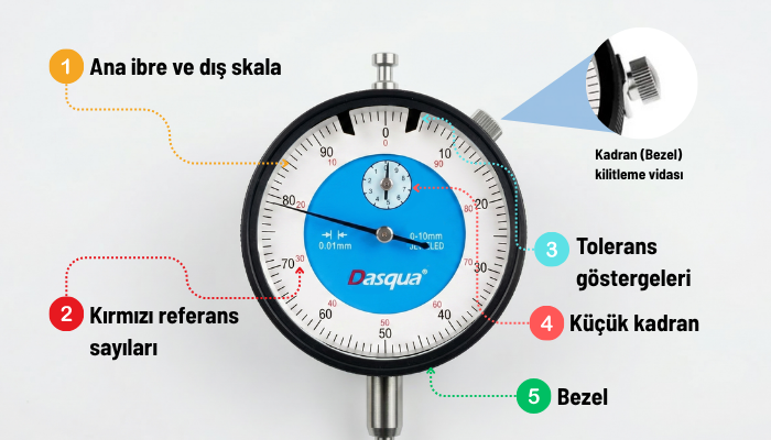 Kadranın üst bölümünde bulunan ayarlanabilir tolerans göstergeleri, ölçüm sırasında kabul edilebilir ölçü aralığının belirlenmesini sağlar. Operatör, ibrenin bu iki gösterge arasında kalıp kalmadığını kontrol ederek parçanın tolerans sınırları içinde olup olmadığını hızlıca değerlendirebilir. Bu özellik özellikle seri üretim ve kalite kontrol uygulamalarında pratiklik sağlar.