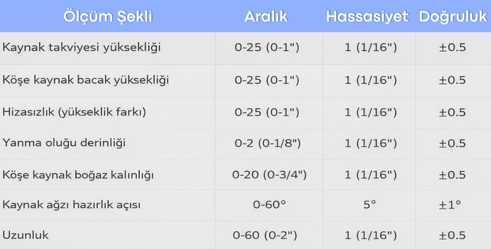 - Takviye yüksekliği, alt kesme miktarı, köşe kaynak ayak ölçüsü, boğaz kalınlığı, hizalama farkı ve uzunluk gibi temel kaynak parametrelerinin hızlı ve pratik biçimde kontrol edilmesine yardımcı olur.