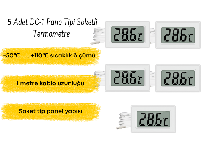 DC-1 mini soketli termometre; basit kullanıma sahip, üzerinde herhangi bir düğmesi bulunmayan, 1 metre kablolu termometredir. Bu üründen 1 adet sepete attığınızda, tarafınıza 5 adet beyaz renkli DC-1 termometre gönderilecektir.