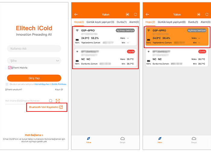 Akıllı cihazınıza Google Play Store veya App Store üzerinden “Elitech iCold” uygulamasını indirin ve çalıştırın. Ardından GSP-6 PRO cihazınızı açın.Uygulamayı üye olarak veya üye olmadan kullanabilirsiniz. Üyelik oluşturmak istemiyorsanız, ilk görselde gösterildiği gibi “Bluetooth Veri Kaydedici” seçeneğine dokunarak devam edebilirsiniz.