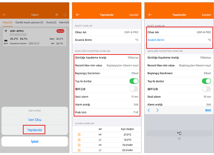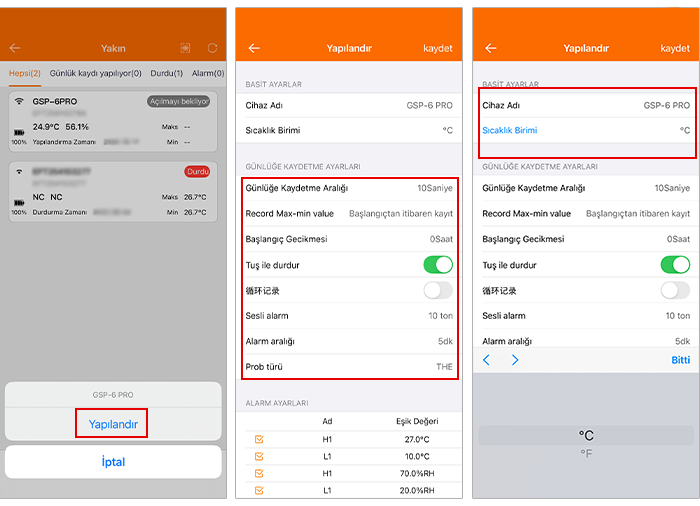 Bu bölümde, cihazın başlangıç gecikmesi, kayıt aralığı, cihaz ismi, sıcaklık birimi (°C/°F), sıcaklık ve nem alarm eşikleri gibi birçok fonksiyonu kolaylıkla düzenleyebilirsiniz.