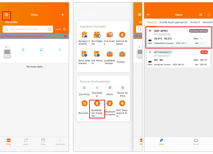 Birden fazla datalogger cihazınız bulunuyorsa veya daha önce sisteme kayıt yaparak cihaz tanımladıysanız, ikinci görseldeki gibi tüm cihazlar listelenir. Doğru cihaza işlem yapmak için, cihazın arkasında yer alan seri numarasını uygulamadaki listede görünen seri numaralarıyla karşılaştırabilirsiniz. (Not: Uygulamada seri numaraları normalde bulanık görünmez.)