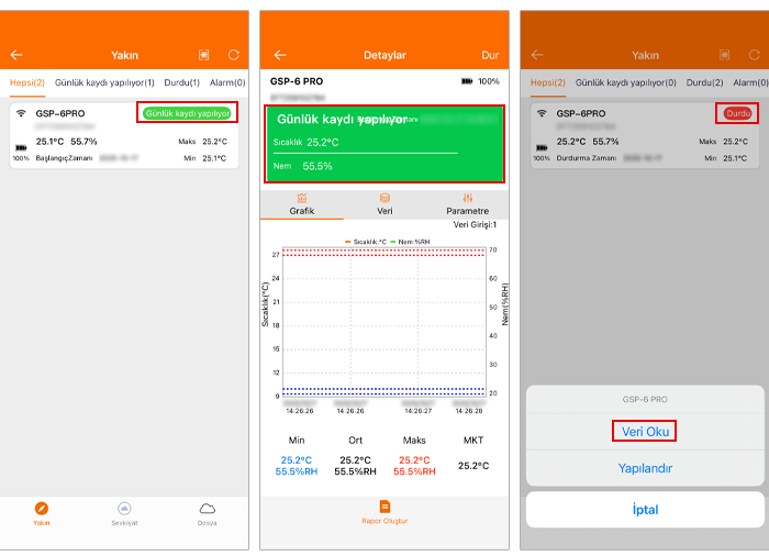 Kaydedilen verileri görüntülemek için, üçüncü görselde gösterildiği üzere “Veri Oku” seçeneğine dokunarak ölçüm kayıtlarını inceleyebilirsiniz.