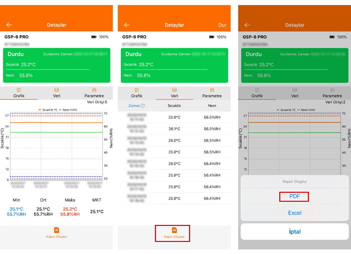 Ayrıca “Rapor” bölümünden, elde ettiğiniz ölçüm verilerini PDF ya da Excel formatında dışa aktararak bilgisayarınıza kaydedebilir veya paylaşabilirsiniz.