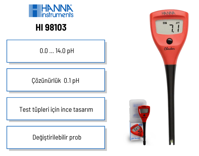 • Hanna HI 98103 pH metre cihazının en büyük özelliği 103 mm lik ince probu sayesinde test tüplerine, şişelere ve küçük ağızlı diğer kaplara kolayca sığmaktadır.