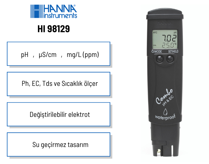 • HI 98129 ile yüksek oranda doğruluk pH, EC, TDS ve sıcaklık ölçümleri sunan su geçirmez bir test cihazıdır.