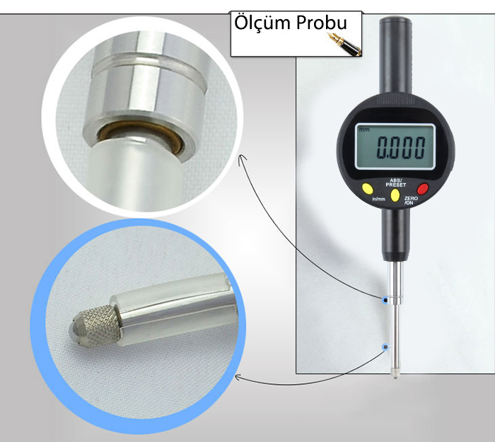 Yukarıdaki görselde Loyka 5310-25 dijital komparatör saatinin butonlarını ve probunu yakın plandan görebilirsiniz.