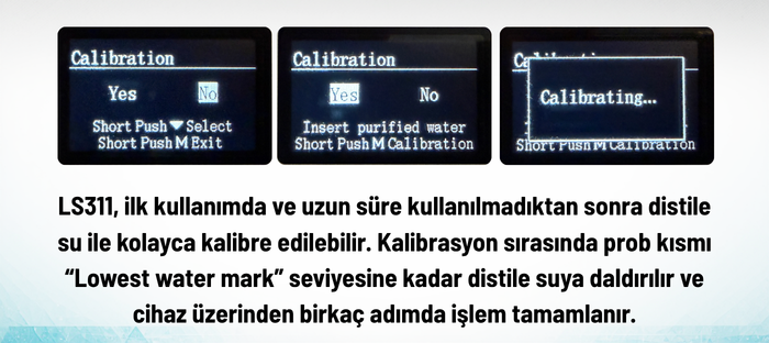 Sensör kısmı saf suya daldırıldıktan sonra M tuşuna kısa basın. Cihaz kalibrasyon sürecini başlatacaktır.