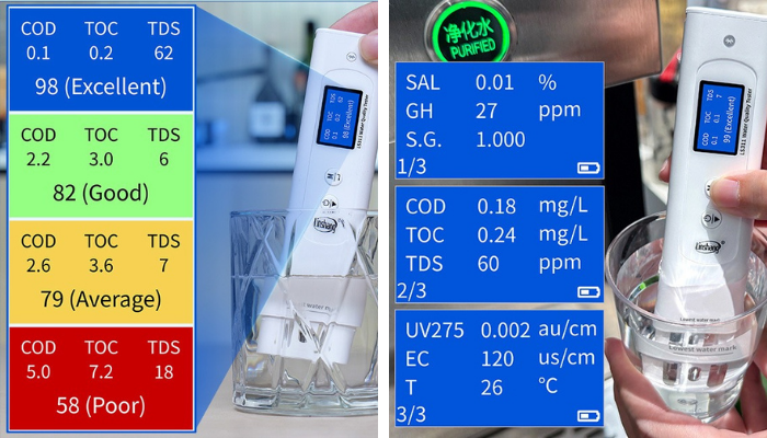 - LS311 çok parametreli su kalitesi ve tuzluluk ölçer, içme suyu ve farklı su örneklerinde 9 farklı parametreyi aynı anda ölçebilen taşınabilir bir su test cihazıdır. Tek ölçümle COD, TOC, UV275, TDS, elektriksel iletkenlik, tuzluluk, sertlik, özgül ağırlık ve sıcaklık değerlerinin birlikte değerlendirilmesine yardımcı olur.