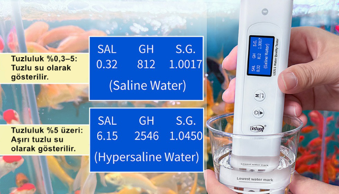 Akvaryum ve tuzlu su uygulamalarında tuzluluk (SAL), genel sertlik (GH) ve özgül ağırlık (S.G.) değerlerini birlikte göstererek suyun genel yapısının daha pratik ve daha kolay değerlendirilmesine yardımcı olur.