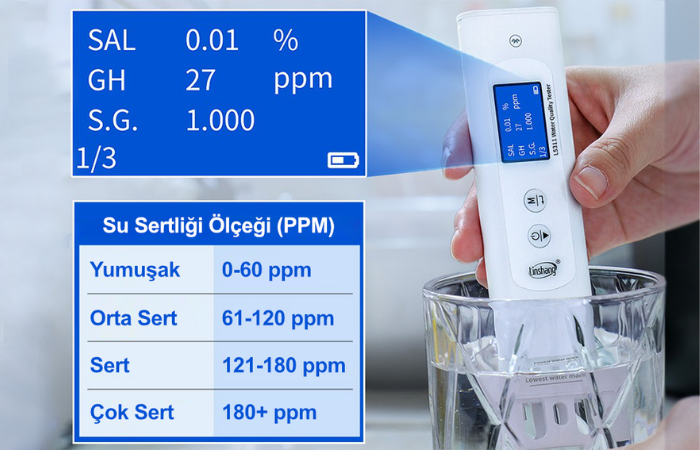 Su sertliği (GH) değerini ppm cinsinden göstererek suyun yumuşak, orta sert, sert veya çok sert karakterde olup olmadığının daha kolay değerlendirilmesine yardımcı olur.