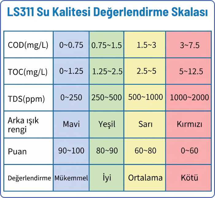 Su kalitesi referans tablosu; COD, TOC ve TDS ölçüm sonuçlarına göre ekran renklerini, puan aralıklarını ve genel kalite değerlendirme seviyelerini hızlı ve pratik şekilde yorumlamaya yardımcı olur.