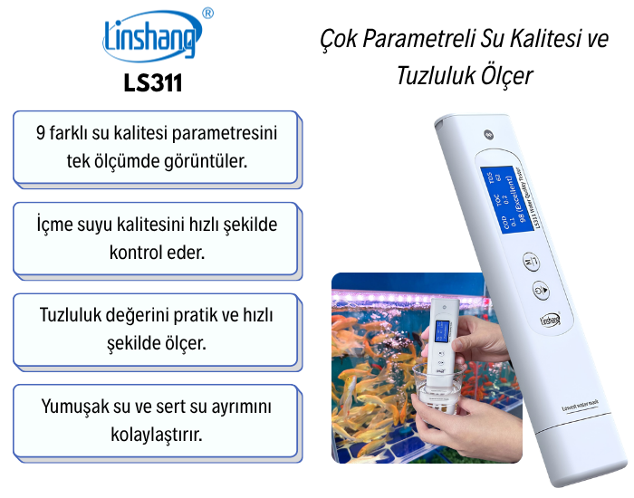 LS311; içme suyunun hızlı kalite kontrolü, ev ve ofis tipi su arıtma cihazlarının çıkış suyunun izlenmesi, akvaryum suyu takibi, deniz akvaryumu ve tuzlu su sistemlerinde tuzluluk kontrolü, balık yetiştiriciliği ve akuakültür uygulamaları ile kaynak suyu ve farklı su örneklerinin karşılaştırmalı değerlendirilmesi gibi birçok alanda kullanılabilir. Çok parametreli ölçüm yapısı sayesinde yalnızca tek bir değere göre değil, suyun genel durumu hakkında daha kapsamlı ve daha bilinçli yorum yapılmasına yardımcı olur.