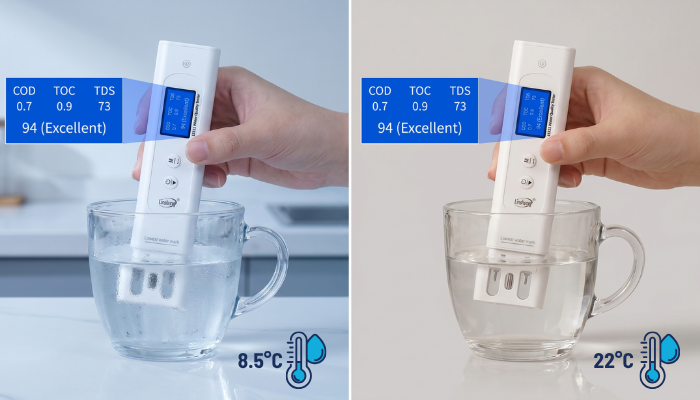 Sıcaklık, ölçüm yapılan su örneğinin anlık sıcaklık değerini gösterir. Su sıcaklığı, diğer bazı parametrelerin yorumlanmasını etkileyebileceği için ölçüm değerlendirmesinde önem taşır. Cihazın sıcaklık bilgisini de göstermesi, sonuçların daha doğru yorumlanmasına katkı sağlar.