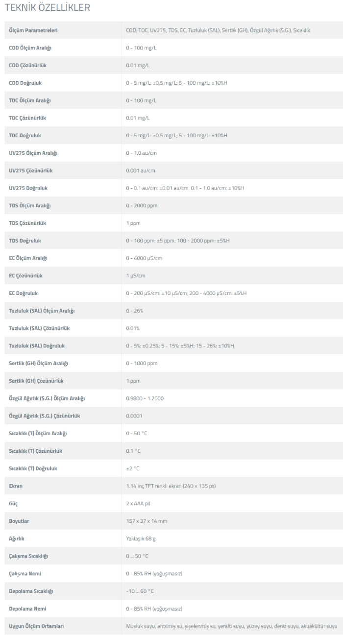 - TDS, EC, tuzluluk, sertlik ve özgül ağırlık değerleri; cihazın elektrotlar arası iletkenlik ölçüm prensibine dayalı olarak hesaplanır. Bu yapı sayesinde hem düşük iletkenlikli içme sularında hem de daha yüksek tuzluluk seviyesine sahip su örneklerinde pratik kullanım sunar.