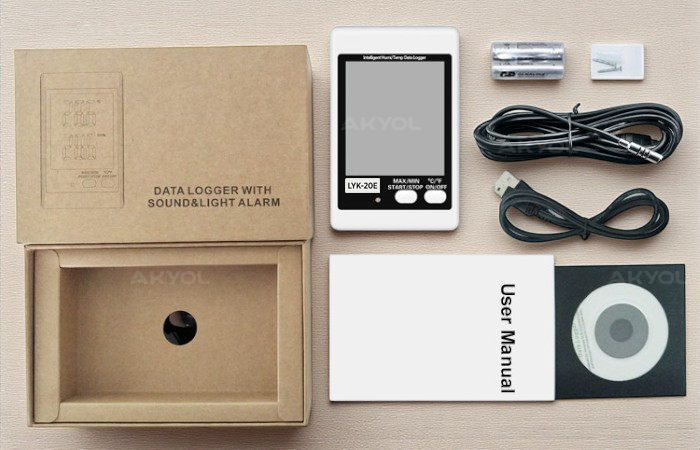 - LYK 20E datalogger cihazını satın aldığınızda, cihazın yanında yazılım CD'si, USB ara kablosu, 3 metrelik harici sensörü, ingilizce kullanma kılavuzu ve pili tarafınıza gelecektir.
