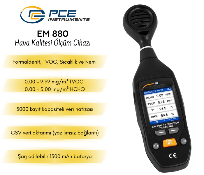PCE-EM 880, iç ortam hava kalitesini hızlı, hassas ve güvenilir şekilde analiz etmek amacıyla tasarlanmış çok parametreli profesyonel bir ölçüm cihazıdır. HCHO (formaldehit), TVOC (Toplam Uçucu Organik Bileşikler), ortam sıcaklığı ve bağıl nem değerlerini tek bir gövde üzerinden eş zamanlı ölçerek ofis, okul, üretim alanı, atölye ve depolarda kapsamlı hava kalite kontrolü sağlar. 5000 ölçüm noktası dahili hafızası sayesinde veriler doğrudan cihaz üzerinde saklanabilir ve CSV formatında bilgisayara aktarılabilir. 1500 mAh kapasiteli dahili bataryası mobil kullanım avantajı sunarken, tripod montajına uygun yapısı sabit ve uzun süreli ölçümler için stabil kurulum imkânı sağlar. Ayarlanabilir alarm fonksiyonu ise kritik eşik değerler aşıldığında kullanıcıyı uyararak güvenli ortam takibini pratik hale getirir.