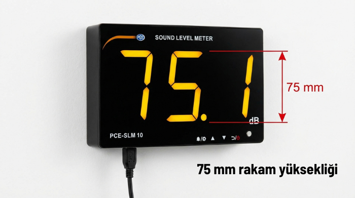- 75 mm yüksekliğindeki büyük ve yüksek kontrastlı LED ekran, ölçülen ses seviyesinin uzak mesafeden ve farklı açılardan net biçimde okunmasını sağlar; duvara monte edildiğinde aynı zamanda etkili bir görsel uyarı paneli olarak kullanılabilir.