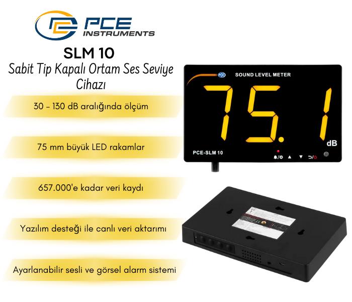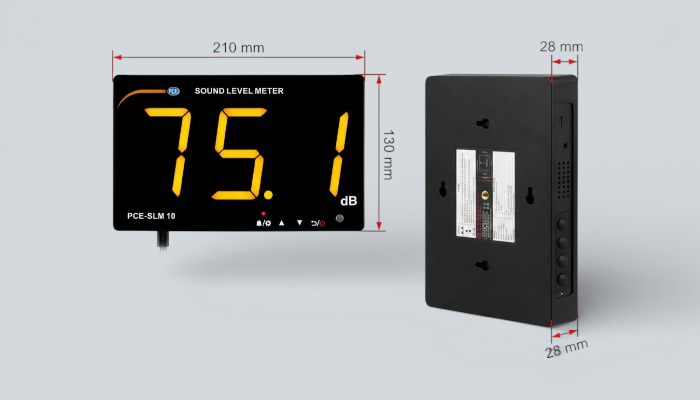 - PCE-SLM 10, ortam gürültüsünün sürekli izlenmesi ve anlık ses seviyelerinin herkes tarafından kolayca görülebilmesi amacıyla geliştirilmiş sabit tip bir ses ölçüm cihazıdır; ofis, okul, restoran ve üretim alanlarında gürültü kontrolü için ideal bir çözümdür.