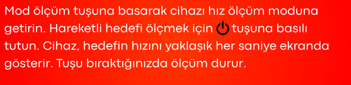 - Entegre hız ölçüm fonksiyonu ile hareketli hedeflerin hızını km/h cinsinden belirleyebilir ve dinamik ölçüm gerektiren uygulamalarda etkin kullanım sunar.