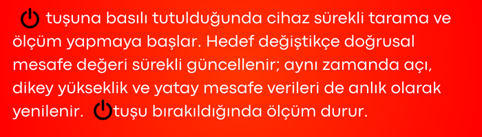 - Cihaz, düz hat mesafesini anlık olarak hesaplayarak kullanıcı ile hedef arasındaki gerçek doğrusal uzaklığı net biçimde gösterir ve özellikle açık saha ölçümlerinde referans mesafenin doğru tespit edilmesine yardımcı olur.