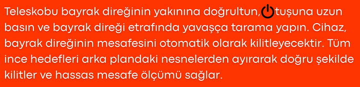 - Bayrak direği kilitleme modu, ince ve uzak hedefleri arka plandan ayırt ederek doğru noktaya odaklanmanıza yardımcı olur; özellikle golf sahalarında bayrak direğinin net şekilde algılanmasını sağlar.