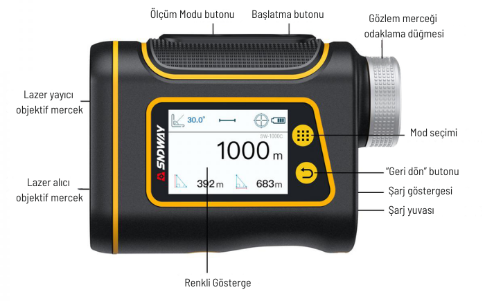 SW-1000C lazer mesafe ölçer teleskop, 1000 metre yani 1 km 'ye kadar mesafe ölçümü yapabilen, darbeli lazer ölçüm teknolojisi ile çalışan, uzun mesafelerde yüksek doğruluk sağlayan profesyonel bir mesafe ölçüm cihazıdır.