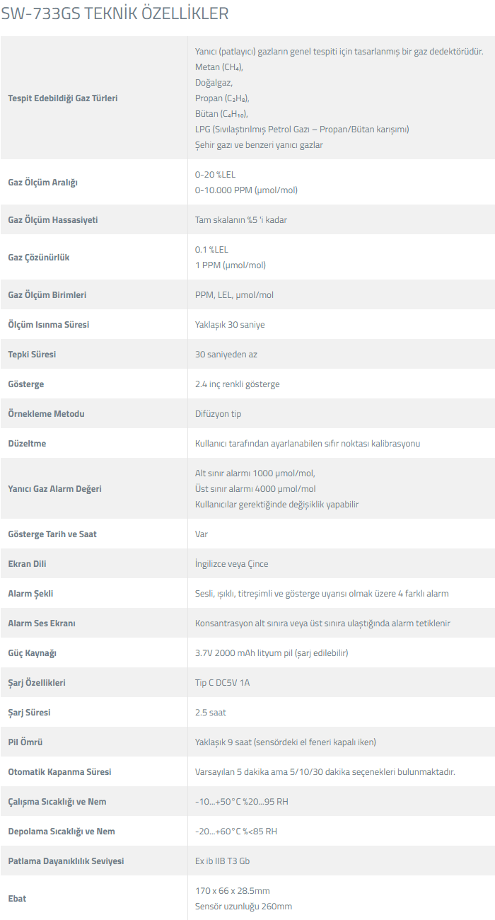 SW-733GS Gaz Dedektörü Özellikleri
