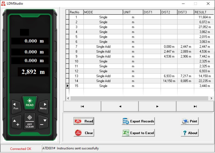 - Lazermetrenin LDM Studio PC yazılımı sayesinde daha önce cihazda kaydedilmiş ölçümlerin USB bağlantısı üzerinden tüm detaylarıyla bilgisayara aktarılmasına imkân tanır; ayrıca cihaz bilgisayara bağlı durumdayken anlık ölçümlerin doğrudan PC üzerinden izlenmesi ve kaydedilmesi de mümkündür.