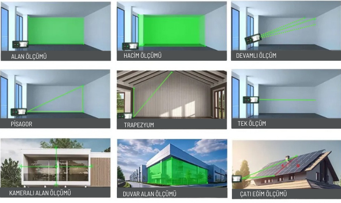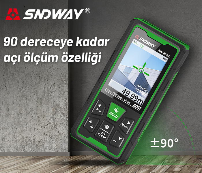 - SNDWAY SW-80GQ mesafe ölçer, farklı kullanım senaryolarına yönelik kapsamlı ölçüm fonksiyonlarıyla donatılmıştır. İki nokta arası mesafe ölçümü, sürekli (devamlı) ölçüm, alan ve hacim hesaplama, Pisagor yöntemi, duvar alanı ölçümü ile toplama–çıkarma işlemleri ve bunların farklı varyasyonlarını destekleyerek; profesyonel ölçüm uygulamalarında yüksek esneklik, hız ve verimlilik sağlar.