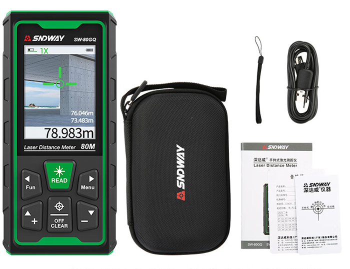 Sndway SW-80GQ lazermetre, 80 metreye kadar ölçüm mesafesi sunan gelişmiş lazer sistemiyle; entegre kamerası ve yeşil lazer teknolojisini birlikte kullanarak özellikle açık alanlarda ve yoğun ışık altında ölçüm yapılmasını kolaylaştırır.