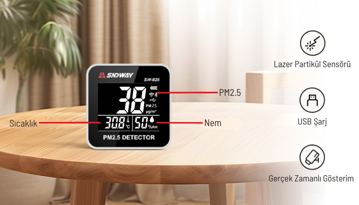 SNDWAY SW-825, iç ve dış ortamlardaki PM2.5 partikül madde yoğunluğunu gerçek zamanlı olarak ölçen şarjlı ve taşınabilir bir hava kalitesi monitörüdür.