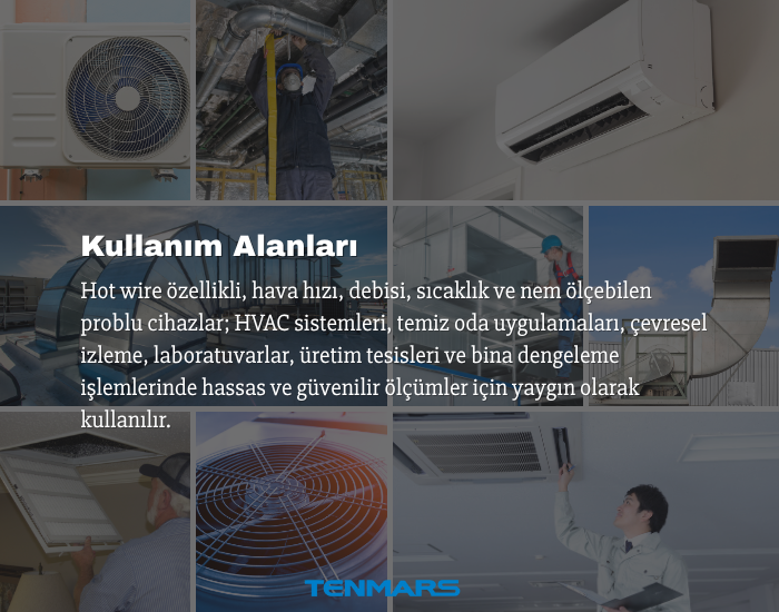 - Bu sıcak tel anemometre; hava akışı dengeleme, yangın güvenliği testleri, boya kabinlerinin hava kontrolü, havalandırma sistemlerinin performans analizi ve çevresel koşulların izlenmesi gibi birçok alanda ideal bir ölçüm cihazıdır.