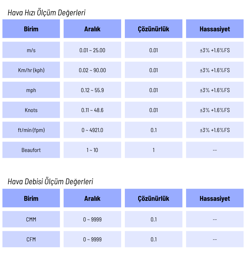- Hava hızı ölçümü, metre/saniye (m/s), feet/dakika (ft/min), kilometre/saat (km/h), knot ve mil/saat (mph), beaufort olmak üzere altı farklı birimde görüntülenebilir.
