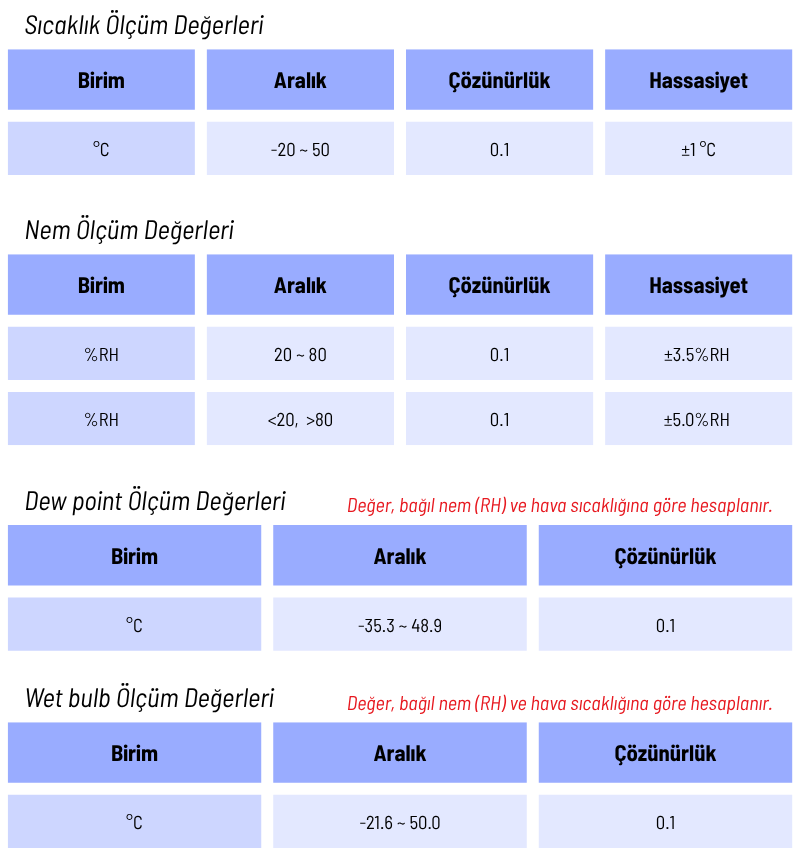 - Cihaz, ortam havasına ait çiğ noktası (dew point) ve yaş termometre (wet bulb) değerlerini otomatik olarak hesaplayabilir.