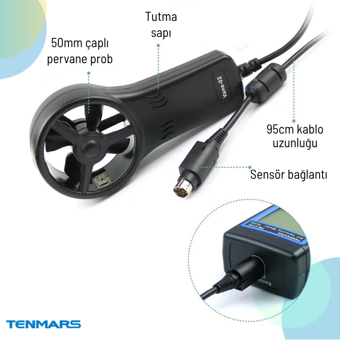 - Cihazın beraberinde gelen Vane-02 model pervane sensörü, 50 mm çapında dört kanatlı bir ölçüm pervanesine sahiptir; bu yapı, düşük ve yüksek hava hızlarında stabil ve hassas veri elde edilmesini sağlar. Örneğin, endüstriyel fan performanslarının kontrolü gibi uygulamalarda güvenilir sonuçlar alınmasına olanak tanır.