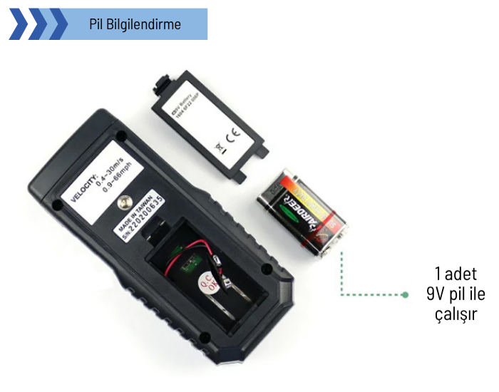 TM412A rüzgar ölçüm cihazı; 1 adet 9V pil ile çalışmaktadır.