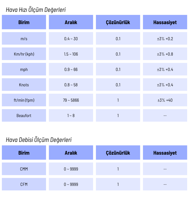 - Cihazın hassas pervane sensörü aracılığıyla üç farklı fiziksel parametre ölçümü yapılabilmektedir: Hava Hızı, Hava Debisi ve Ortam Sıcaklığı. Bu çok yönlü yapı, tek bir cihazla çok sayıda çevresel veriye ulaşılmasını sağlar ve böylece kullanıcıya operasyonel verimlilik kazandırır.