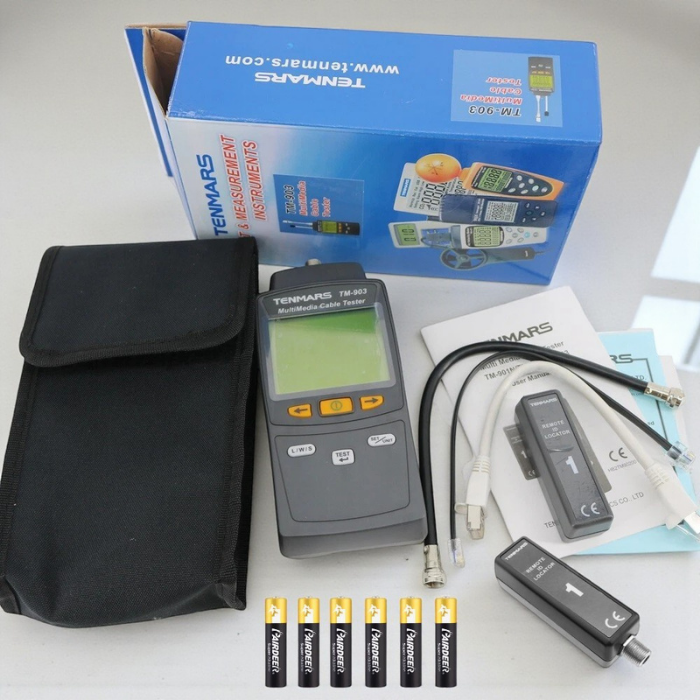 - Ürünün kutu içeriği; TM-903 cihaz, Kullanım kılavuzu, 6 adet 1.5V AAA pil, CAT5 STP kablo, Remote ID (koaksiyel), Remote ID (RJ11), RJ11 telefon kablosu, Koaksiyel Kablo (F-Type Konnektörlü), taşıma çantası parçalarından oluşmaktadır.