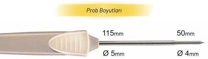 - Gıdaların İç Sıcaklık Ölçümü: T Tipi Termokupl teknolojisi sayesinde, prob hızlı ve doğru bir şekilde gıdaların çekirdek veya iç sıcaklığını ölçmek için özel olarak tasarlanmıştır.