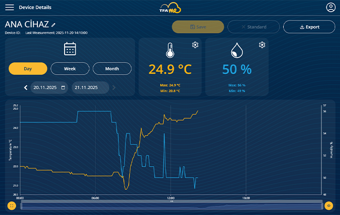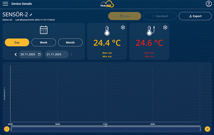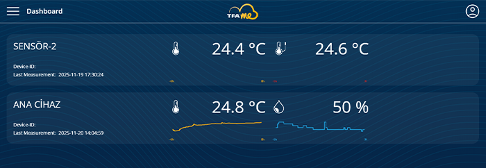 - TFA.me portalı üzerinden bir bakışta tüm sensörleri görüntüleyebilir, sensör bazlı limit değerler belirleyebilir ve günlük, haftalık veya aylık ölçüm raporlarını tablo veya grafik formatında indirebilirsiniz. Sistem aynı zamanda 50 adede kadar TFA-ID sensörünü destekler, bu sayede yapı büyüdükçe izleme altyapınızı kolayca genişletebilirsiniz. Ayrıca tüm ölçüm geçmişi sistemde en az 12 ay süreyle güvenli şekilde saklanır.