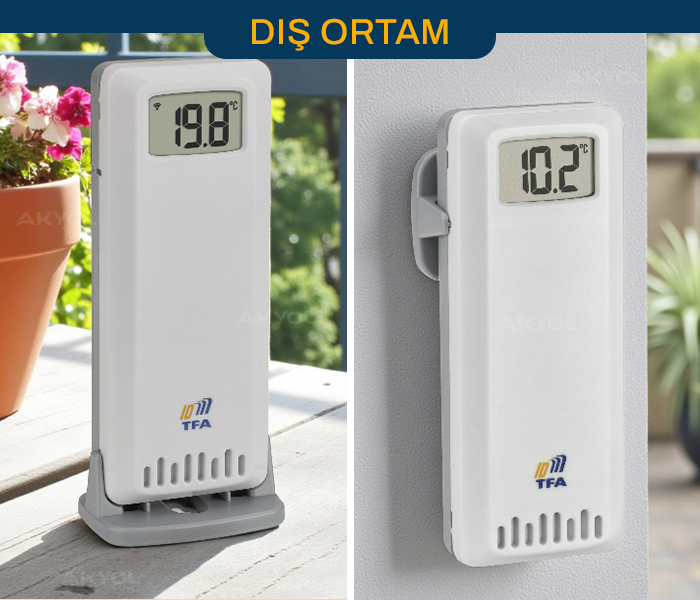 - TFA ana istasyonu iç ortamın sıcaklık ve nemini sürekli ölçerken, paket içerisinden çıkan 3 adet TFA 30.3902.02 sensör hem dış ortam sıcaklığını hem de bağlanabilen prob üzerinden ayrı bir sıcaklık değerini ölçer; sensör ekranında ortam ve prob sıcaklıkları dönüşümlü gösterilirken, ana istasyonda ilgili sensörün yalnızca ortam sıcaklık verisi görüntülenir.