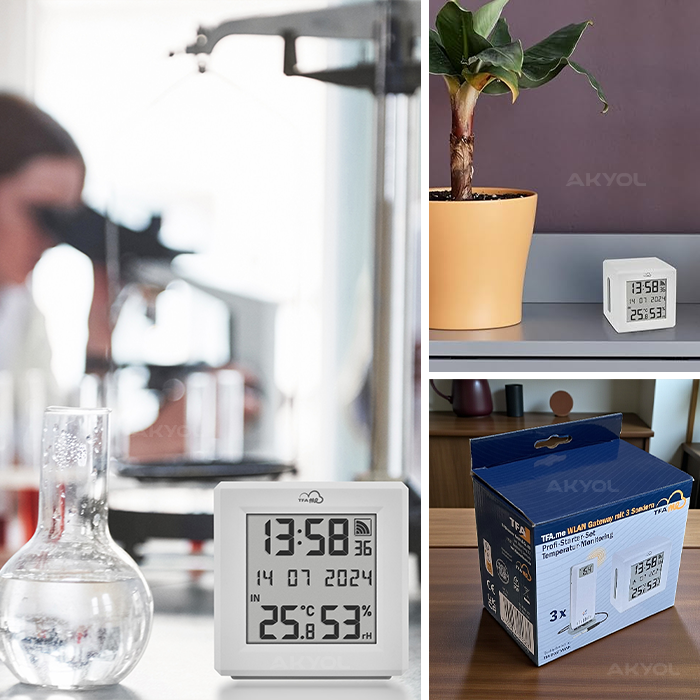 - TFA akıllı WiFi sensörlü izleme seti, üç adet TFA 30.3902.02 (ID-A3) sıcaklık vericisi ve bir adet TFA 35.8104.02 (ID-01) dağıtıcı'dan (gateway) oluşan kapsamlı bir sıcaklık takip çözümüdür. Farklı noktalardan alınan sıcaklık verilerini aynı anda yönetmek isteyen kullanıcılar için tasarlanan bu sistem, geniş alanlarda güvenilir sıcaklık kontrolü sunar.