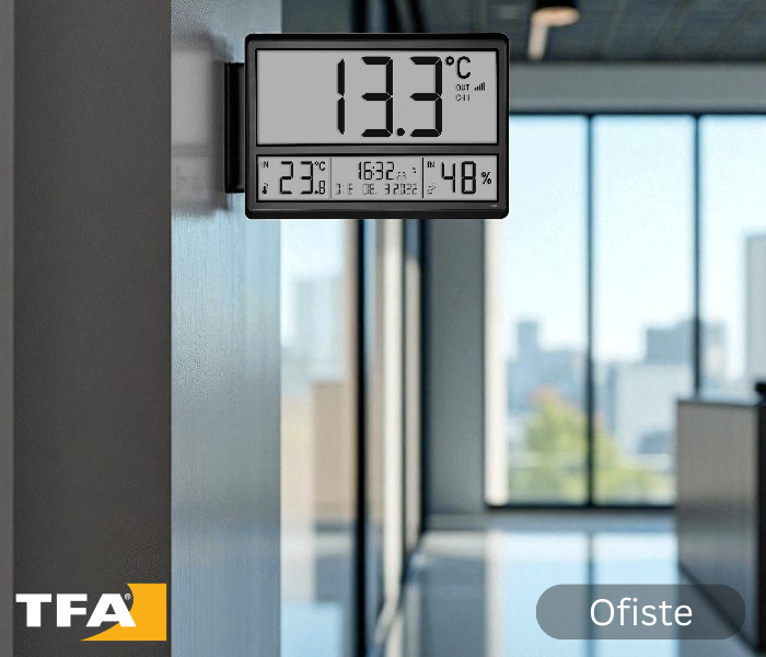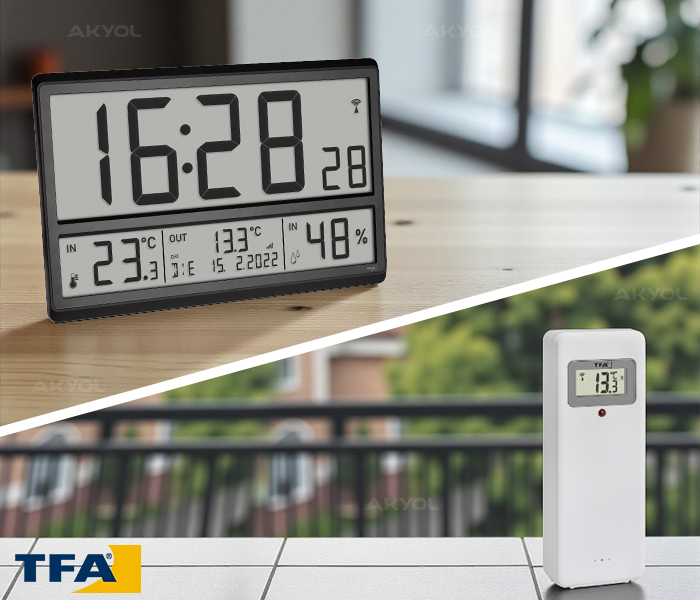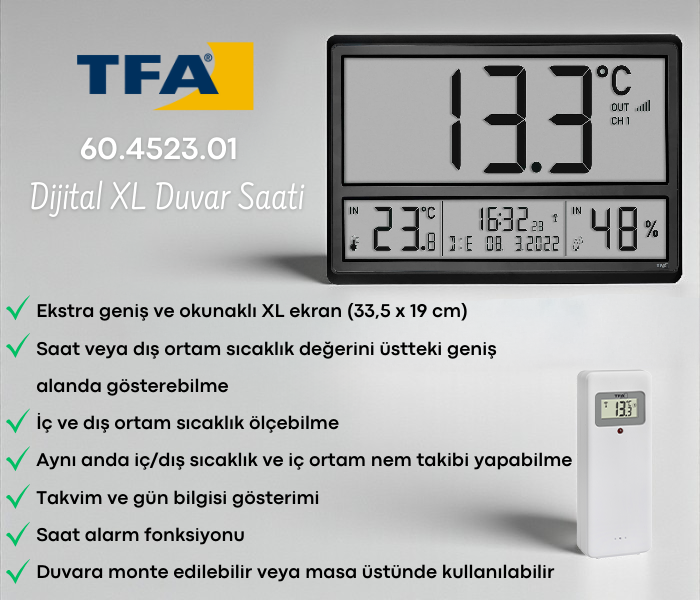 - TFA 60.4523.01, sade ama modern tasarımı sayesinde bulunduğu ortama estetik bir görünüm katarken, aynı zamanda işlevselliği ile günlük yaşamda hem zamanı hem de ortam koşullarını güvenilir bir şekilde takip etmek isteyenler için pratik bir çözüm sunar.