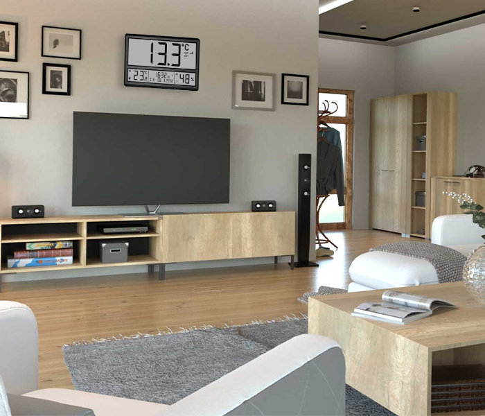 TFA 60.4523.01 Dijital XL duvar saati; tarih ve saati, iç ve dış ortam sıcaklığını ile iç ortamın bağıl nemini aynı anda ekranda gösterir.