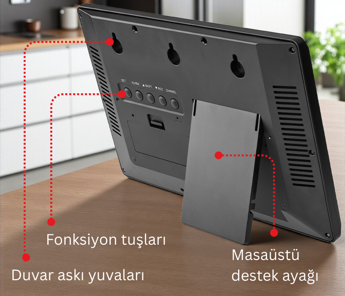 - Cihazın ön panelinde bulunan SET tuşu, saat, tarih, alarm ve dil gibi ayarların yapılabilmesini sağlar; ALARM tuşu, alarm fonksiyonunu açma, kapatma ve ayarlama imkânı sunar; ▲/SHIFT tuşu, değerleri artırma veya menülerde ileri gitme, büyük ekranda saat veya dış ortam sıcaklık değeri gösterimi işlevi görür; ▼/RCC tuşu, değerleri azaltma ve manuel saat ayarını başlatma işleviyle kullanılır; CHANNEL tuşu, dış sensör kanalları arasında geçiş yapılmasına imkan tanır ve farklı sensörlerden gelen verilerin seçilmesini sağlar; RESET tuşu ise cihazı fabrika ayarlarına döndürerek olası yazılım kilitlenmelerinde yeniden başlatma imkânı verir.